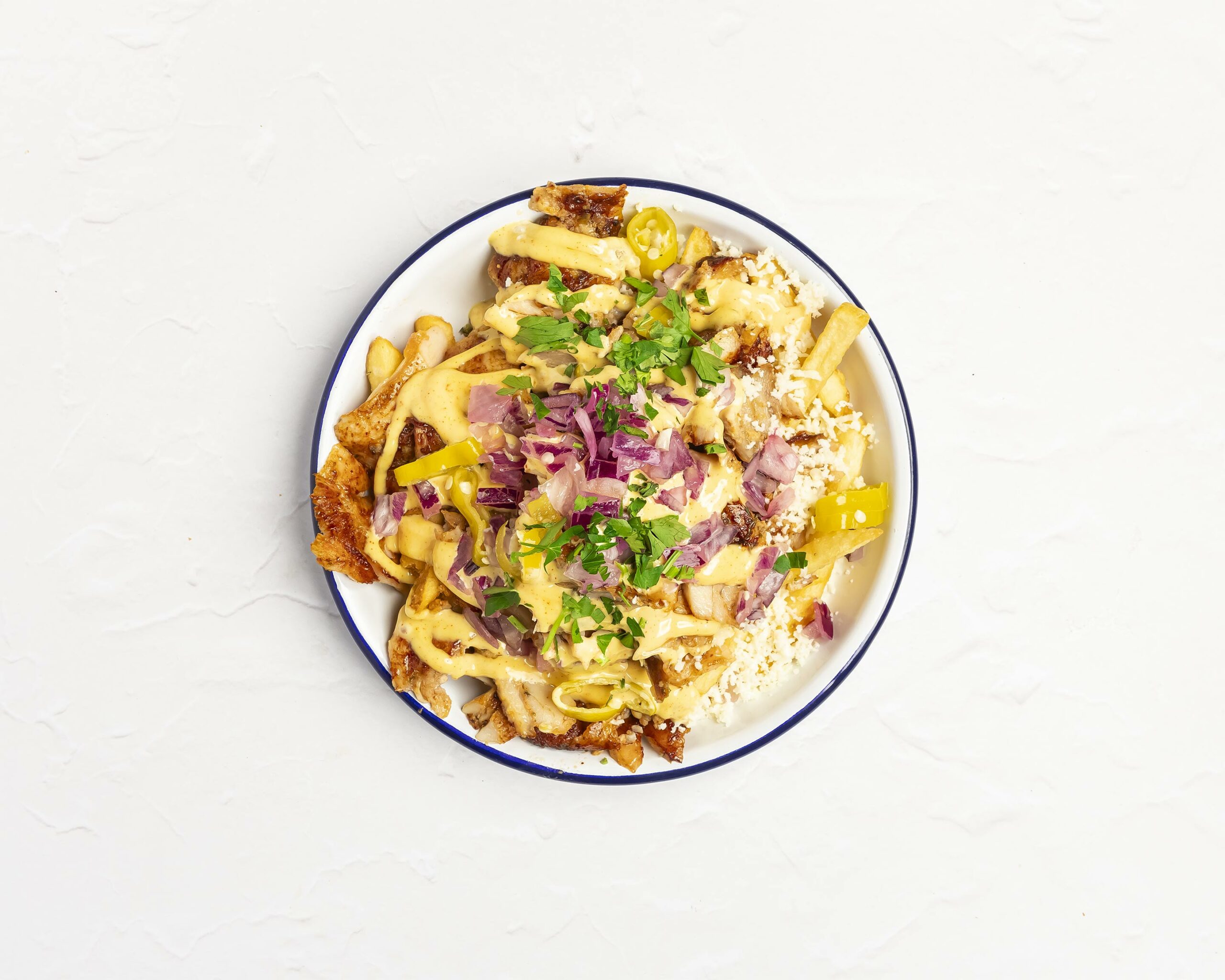 Skin on chips topped with halloumi, lamb gyro meat, red onion, peppers and spiced feta