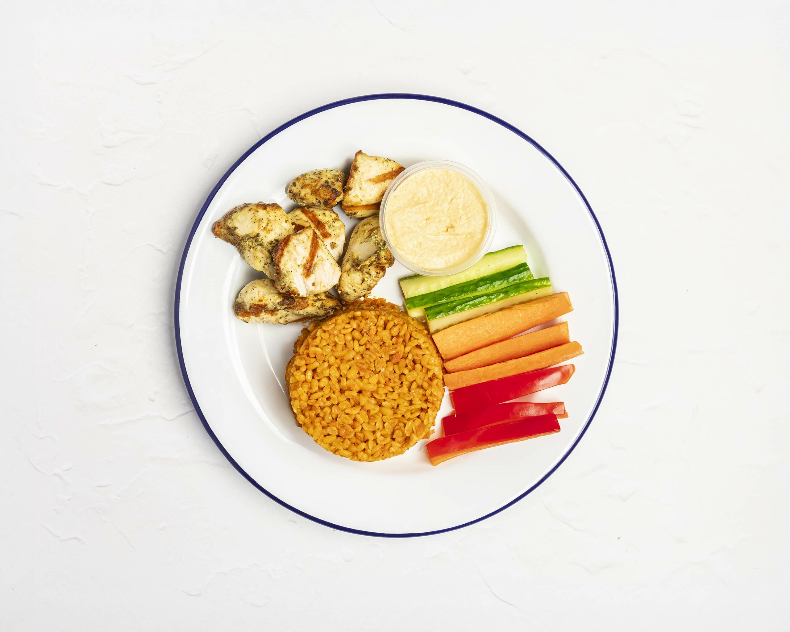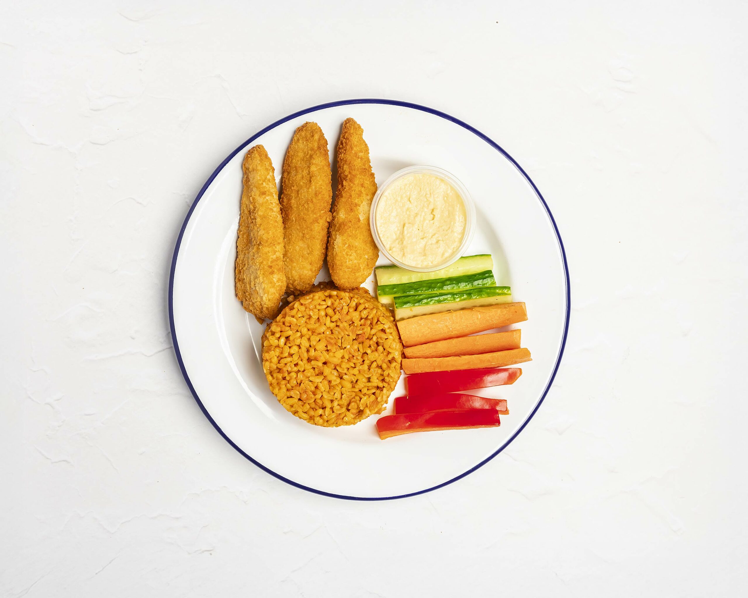 Crispy Chicken strips with either chips or bulgur wheat. Kids meals come with crudités and hummus.