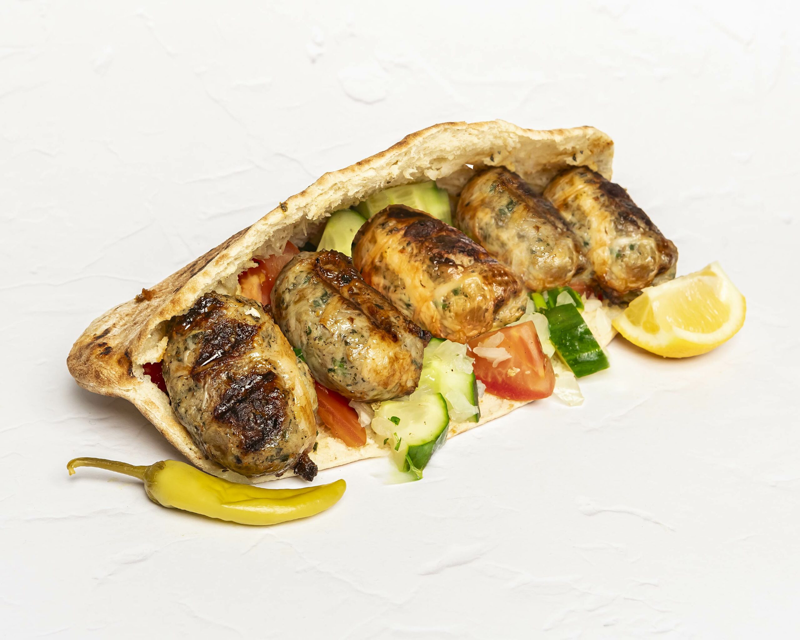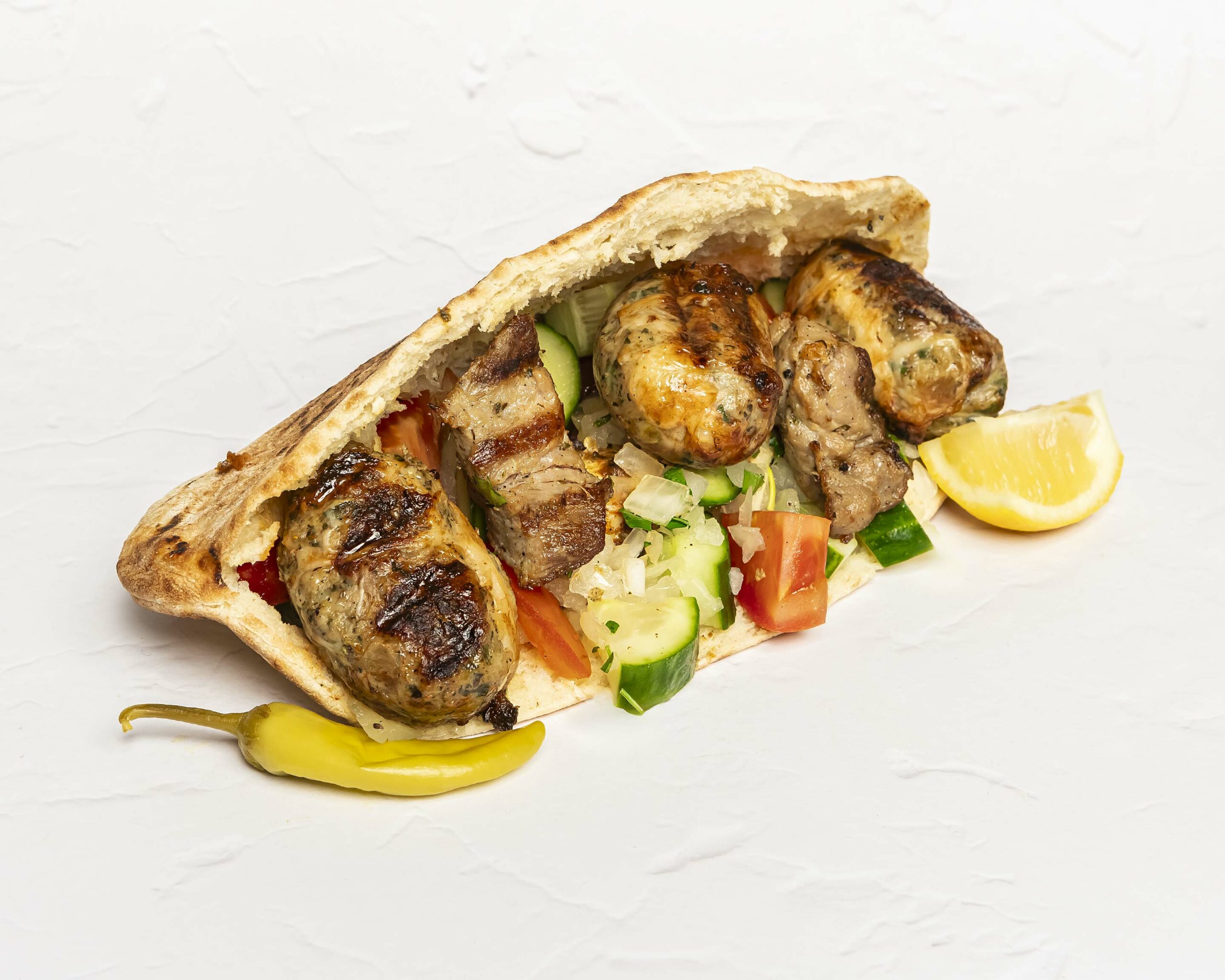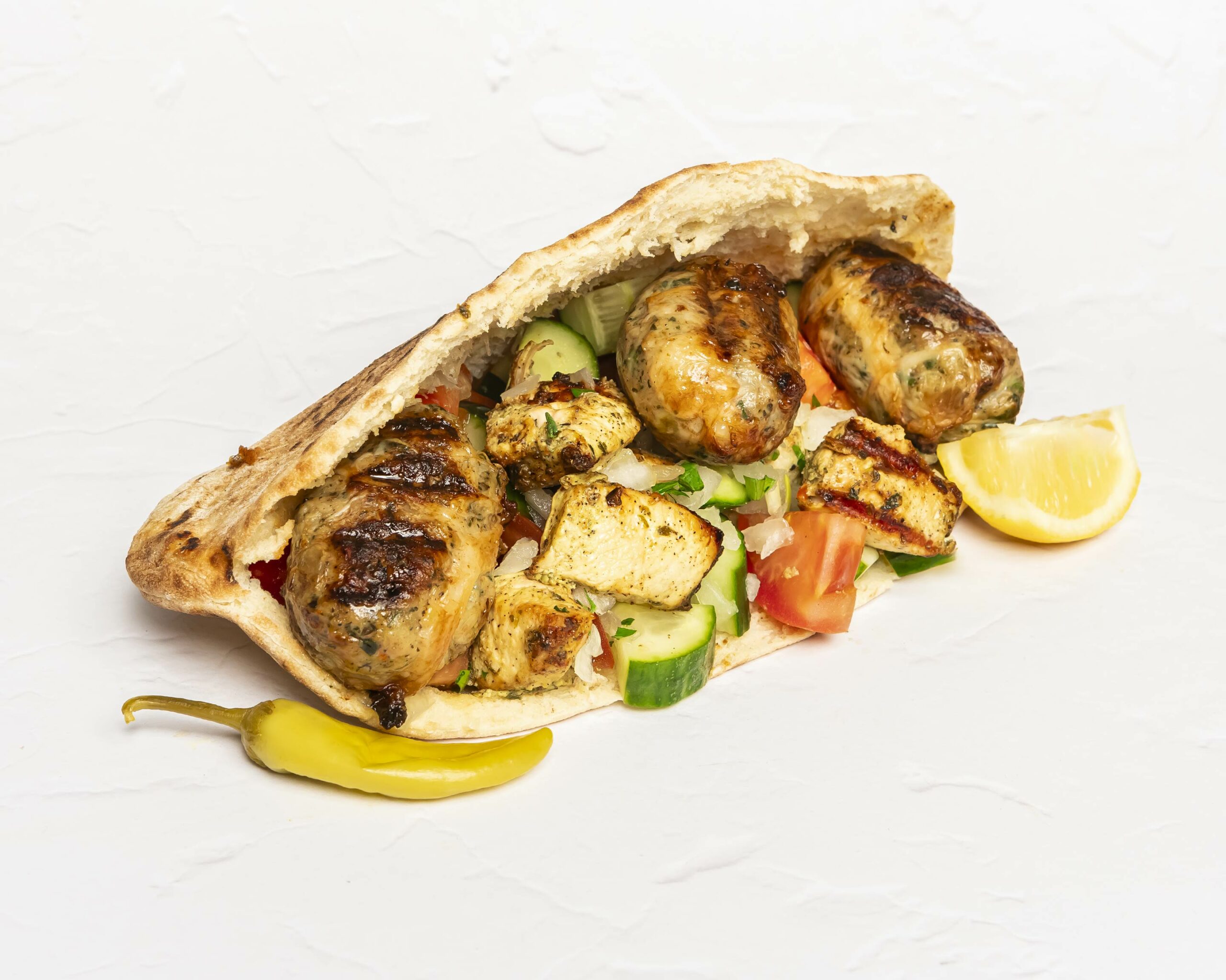 Grilled chicken skewer and sheftalies served inside a Cypriot pitta with tomatoes, onions, cucumber & parsley. Dressed with little olive oil & lemon
