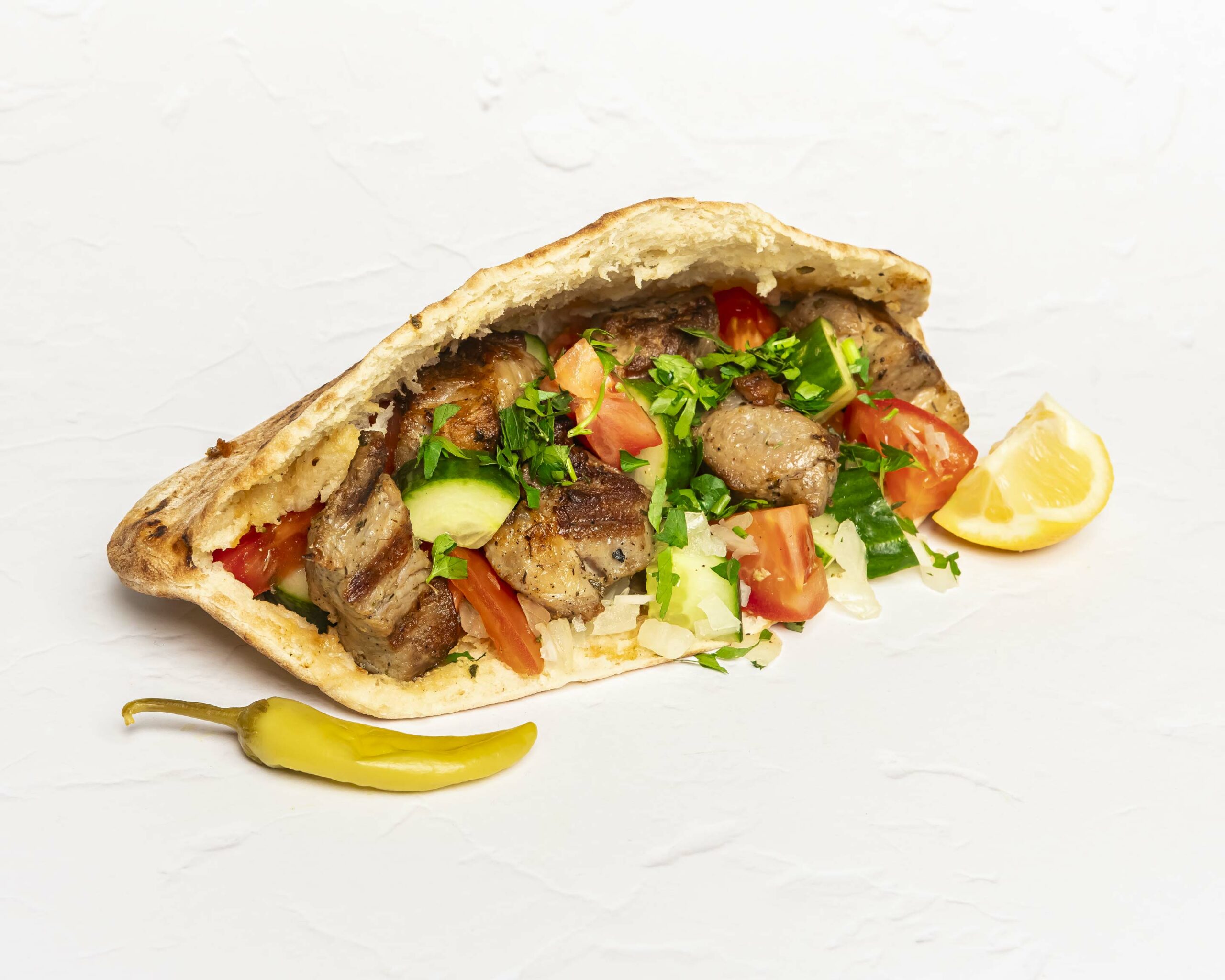 Grilled chicken cubes, served inside our Cypriot pita with tomatoes, cucumbers, onions and parsley. Dressed with a little olive oil & lemon.