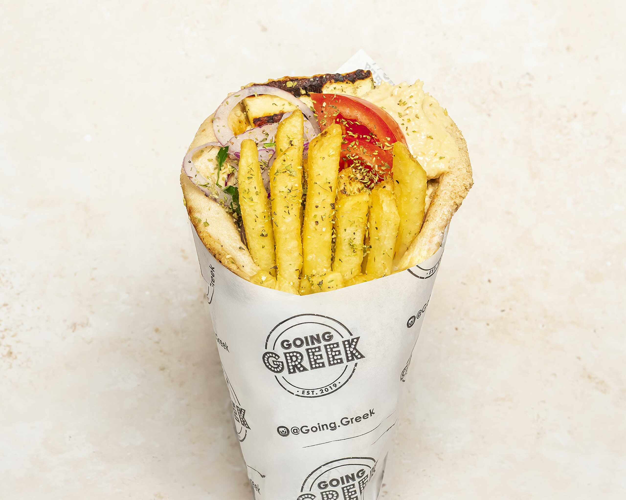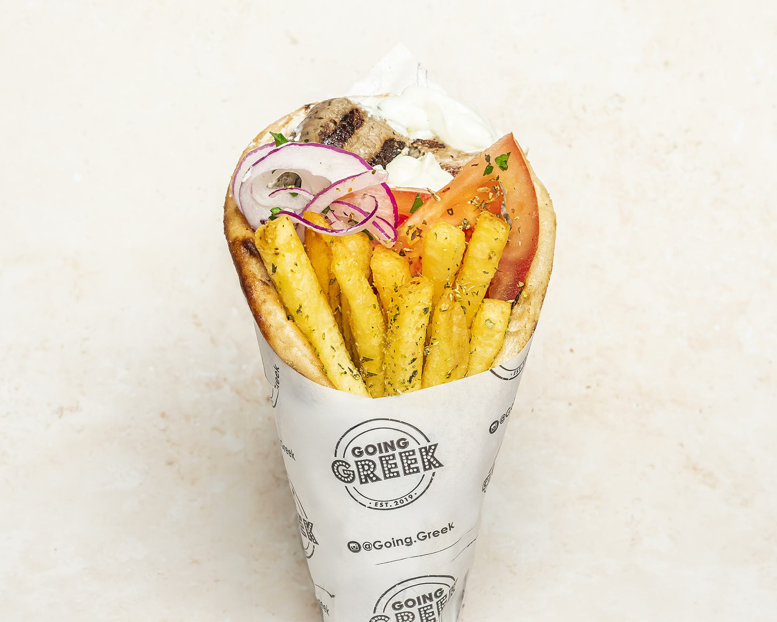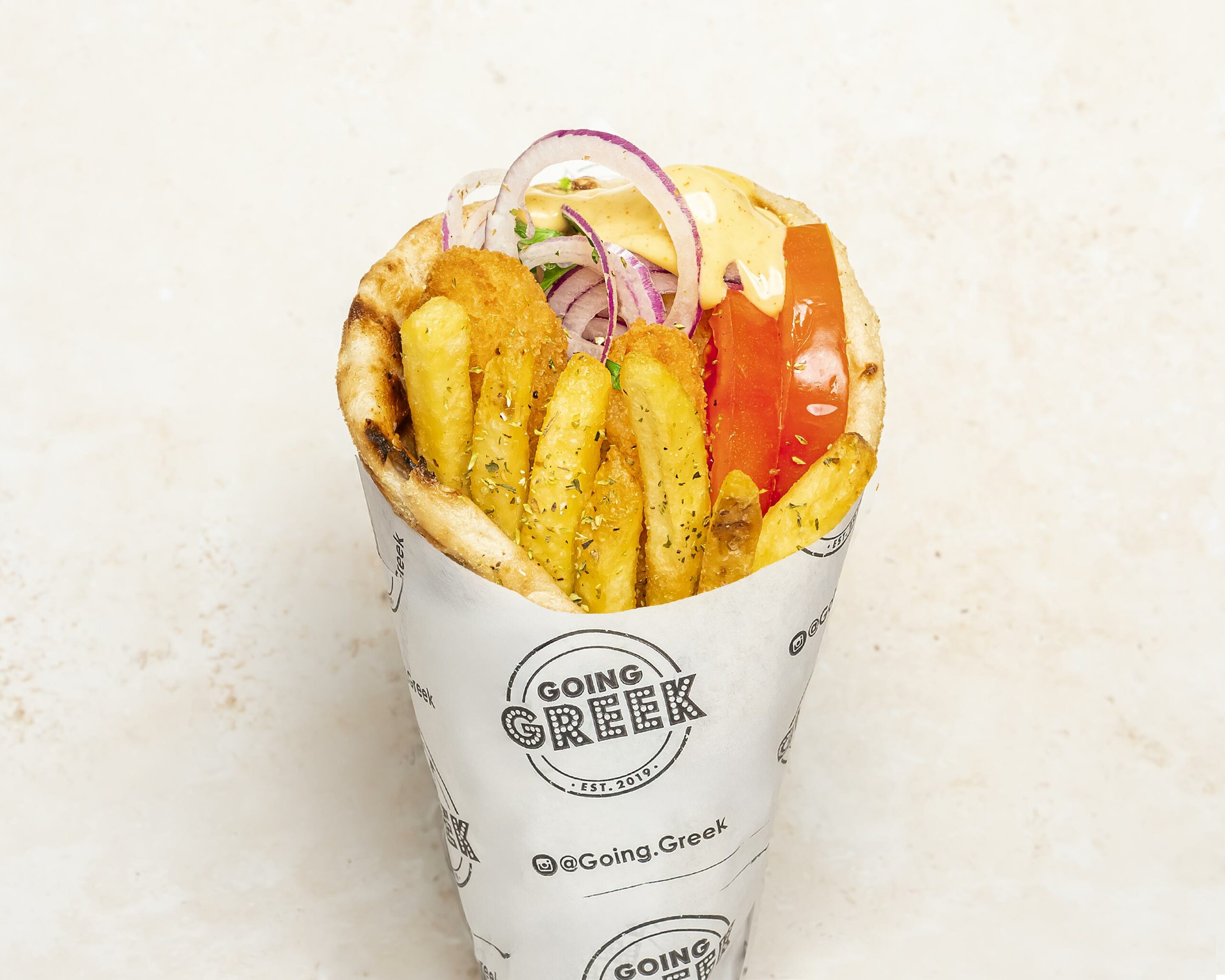 Crispy chicken strips served inside a pita wrap with tomatoes, red onions, parsley, sprinkle of paprika, oregano fries & our famous GG sauce.